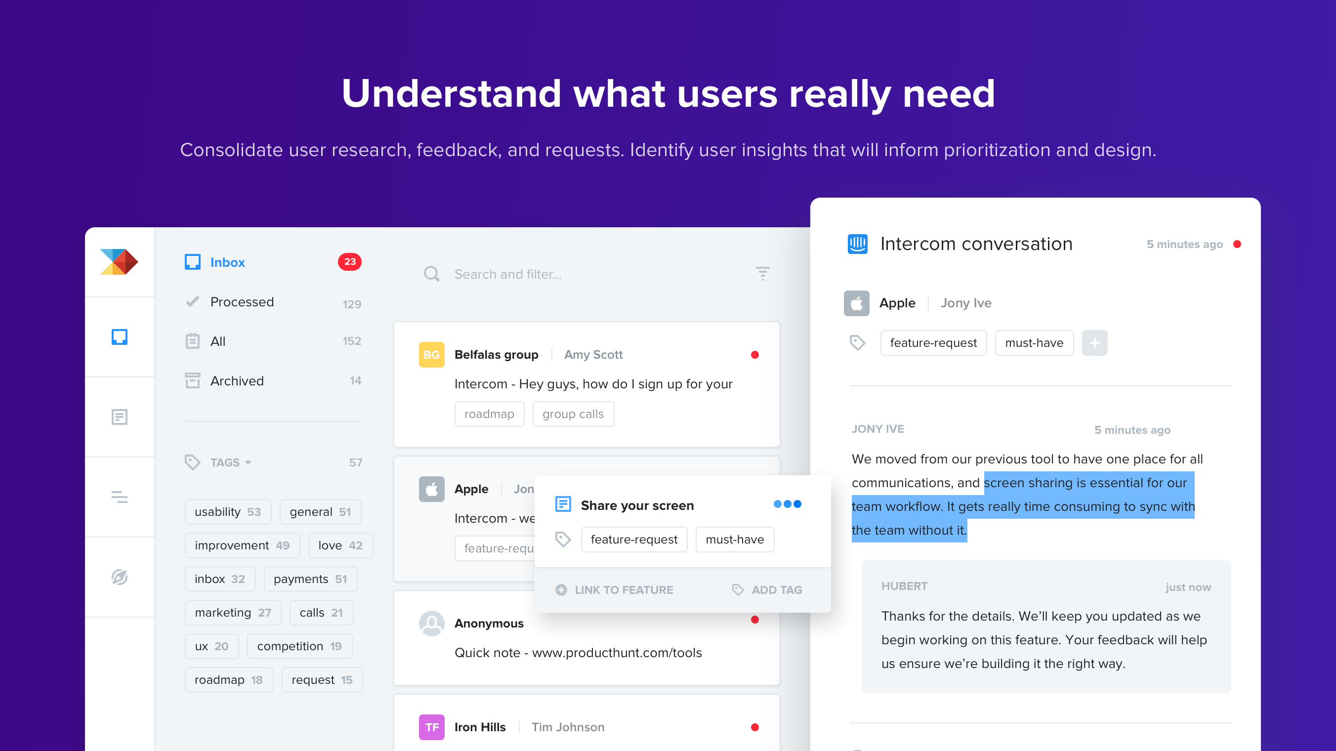 It provides a complete solution for product teams to understand user needs. Instantly connect productboard with the apps you use everyday. Let's design products that matter. Share feature plans, collect user feedback, and source new ideas. Get free demos, compare to similar programs & view screenshots of the tool in use.